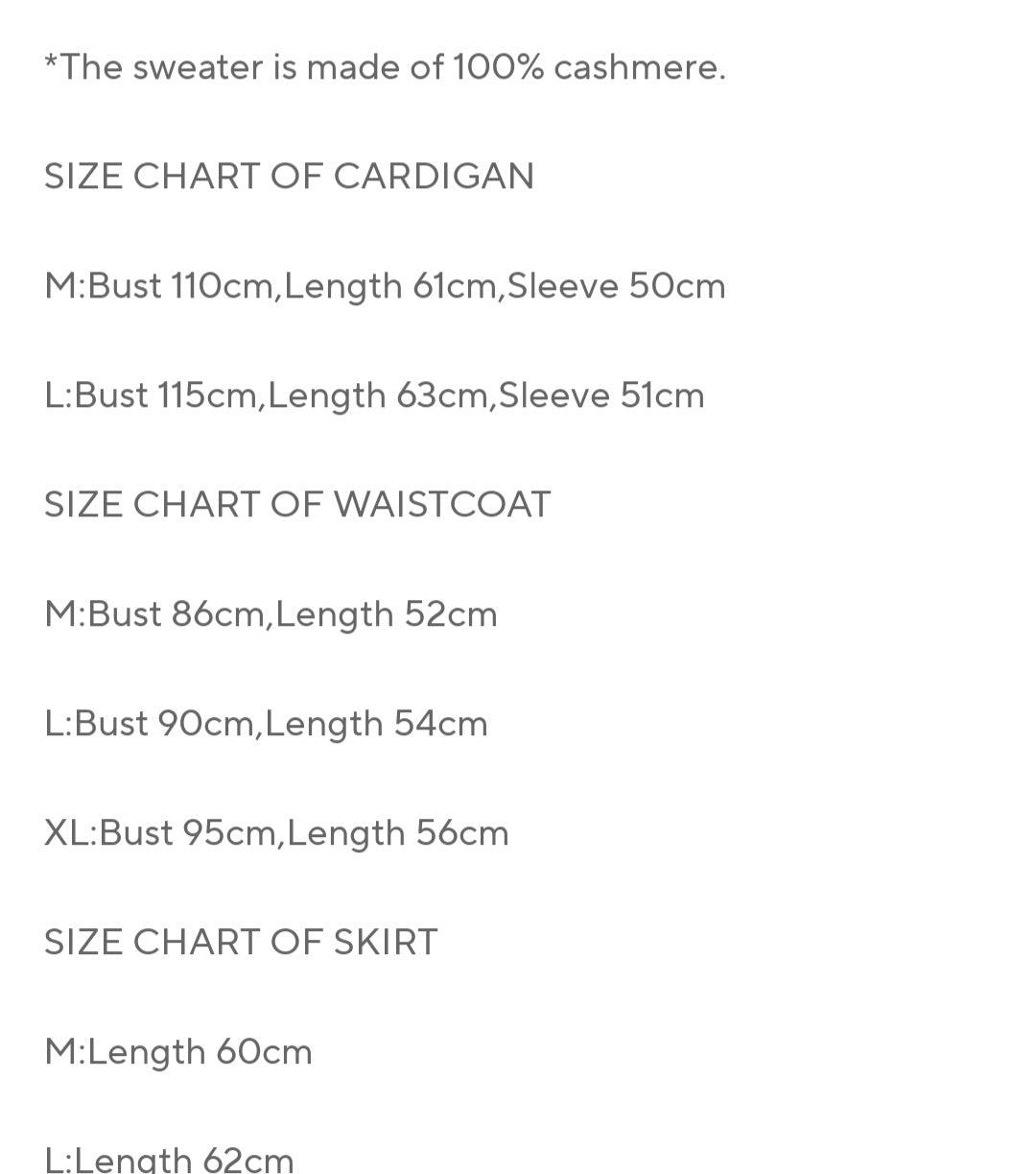 Perfect for middle-aged women, this suit is available in a range of sizes. The cardigan has a bust measurement of 110cm and a length of 61cm, with a sleeve length of 50cm for size M. For size L, the bust measurement is 115cm, length is 63cm, and sleeve length is 51cm. The waistcoat has a bust measurement of 86cm and a length of 52cm for size M, and a bust measurement of 90cm and a length of 54cm for size L. The skirt has a length of 60cm for size M and 62cm for size L.